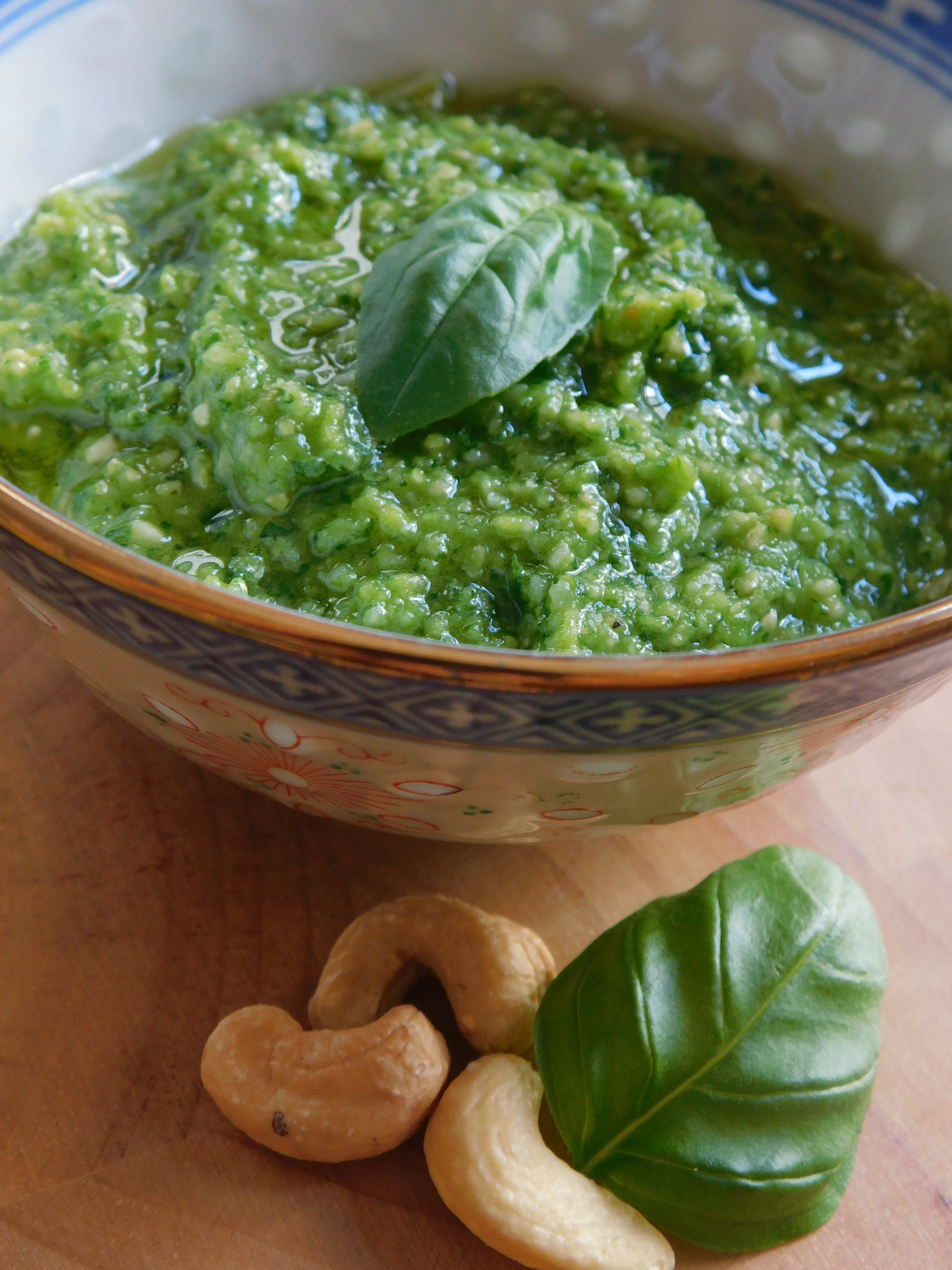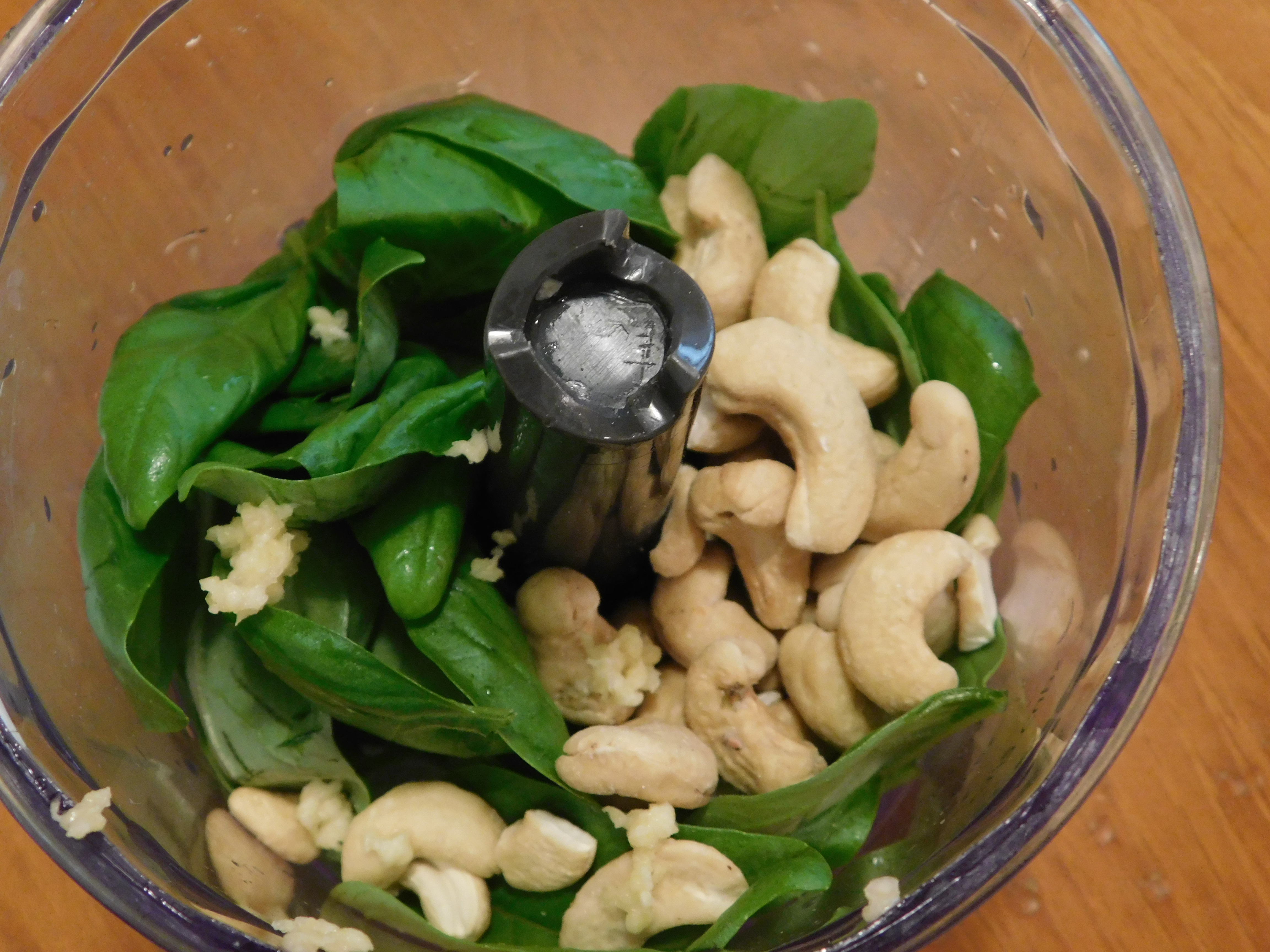 Inserire nel tritatutto le foglie di basilico ben lavate, con lo spicchio d’aglio privato del germe interno, e schiacciato con l’appostito spremiaglio. Unire gli anacardi, (qui li ho usati già tostati e salati) il parmigiano grattuggiato e tanto olio quanto basta per dare la giusta consistenza al pesto. Se necessario aggiungerlo nuovamente durante il processo. Regolare di sale. (In questo caso non ne ho aggiunto visto l’utilizzo degli anacardi già salati.) Se lo si utilizza come condimento per la pasta, ricordarsi di amalgamare la quantità desiderata con un pò d’acqua di cottura.