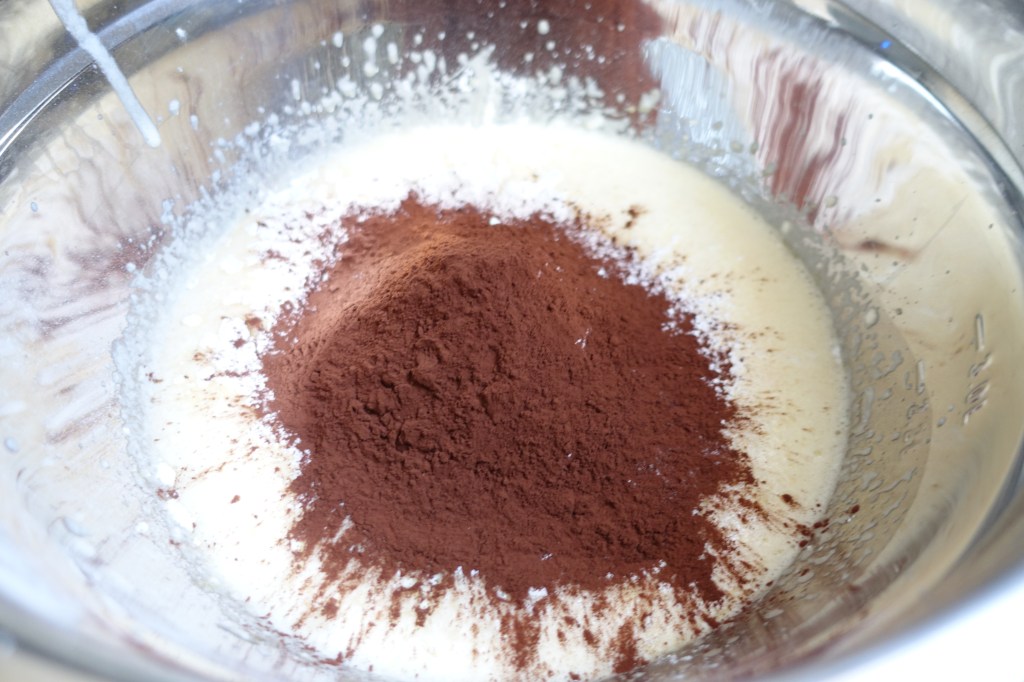Aggiungiamo al composto il latte e il burro ammorbidito. Setacciamo poi all’interno anche la farina, il cacao amaro e il lievito per dolci.