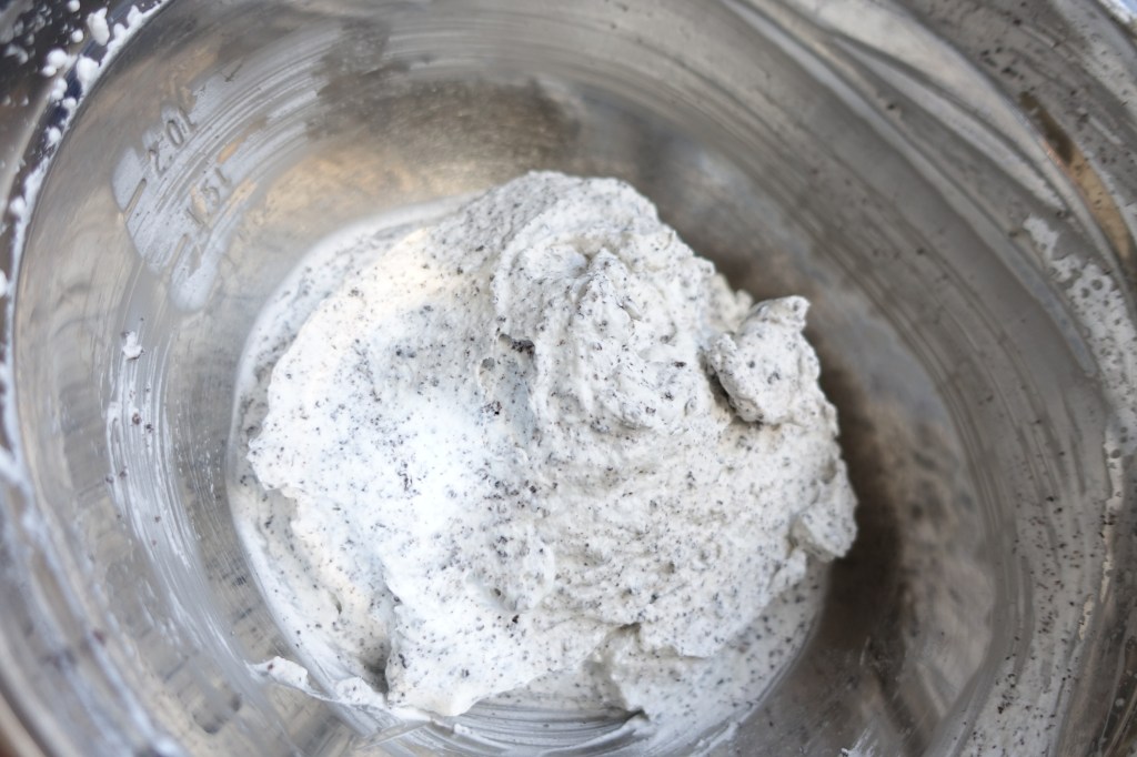 Mentre la nostra base si raffredda per bene possiamo iniziare a preparare la nostra farcitura agli oreo. Cominciamo col montare la panna assieme allo zucchero a velo. Consiglio, la panna deve essere fredda per riuscirla a lavorare bene.