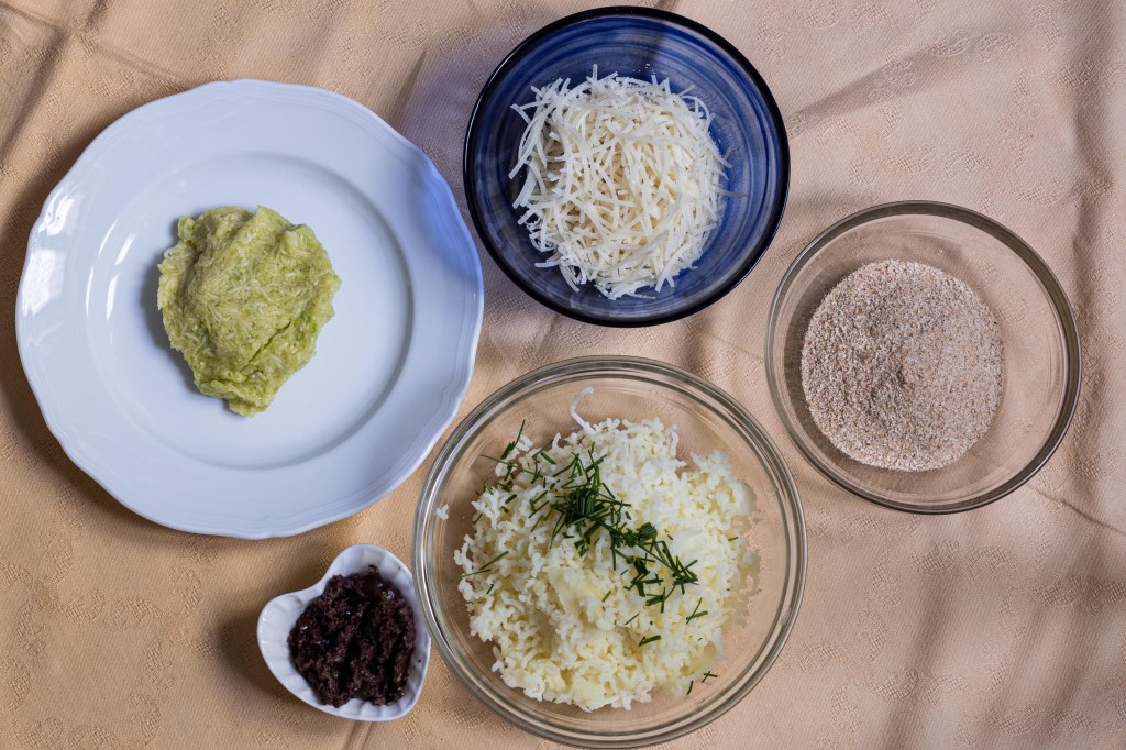 Cuocere le patate al vapore. Pelarle, passarle nello schiacciapatate e lasciarle raffreddare. Con l’aiuto di un robot da cucina o con una grattugia tritare finemente le zucchine, aggiungere un po’ di sale e metterle da parte su un colino per far fuoriuscire l’acqua in eccesso. Dopo circa 10 minuti schiacciare le zucchine per eliminare tutta l’acqua. Sminuzzare l’erba cipollina e tritare le olive.