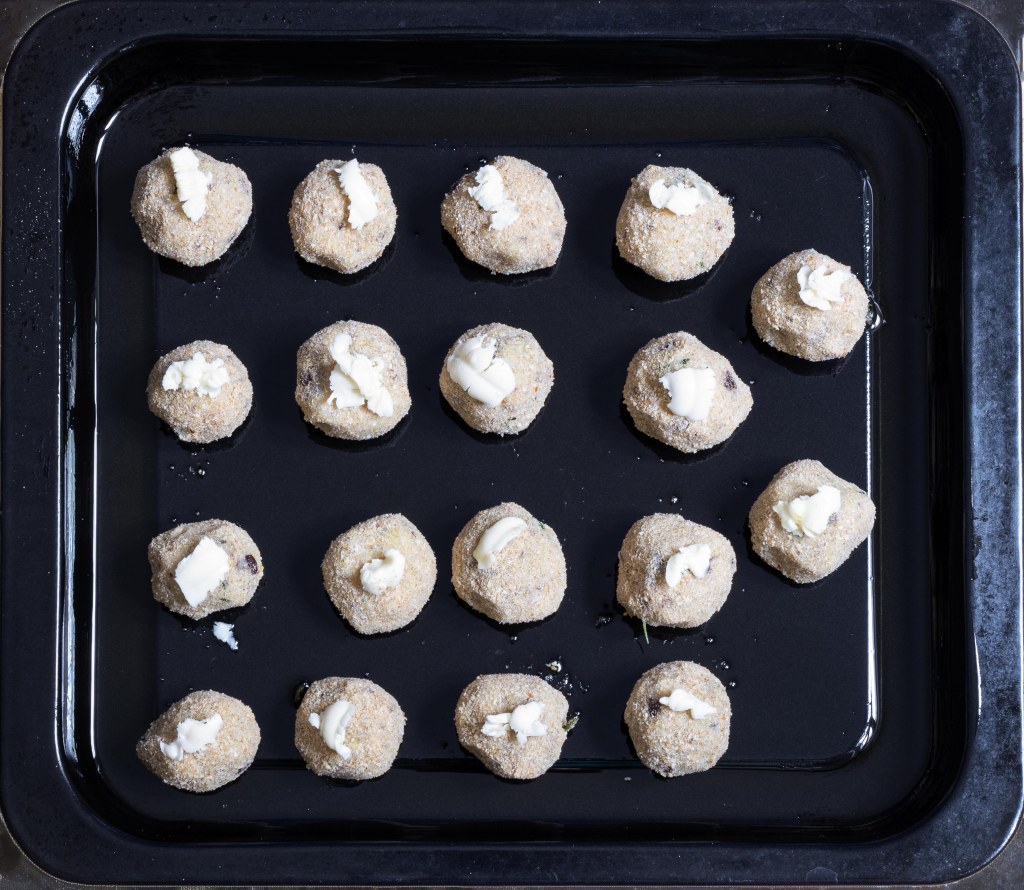 Mescolare tutti gli ingredienti, formare delle palline e passarle nel pangrattato. Disporre le palline in una teglia da forno dopo averla oliata e coprire ogni pallina con un ciuffetto di burro.