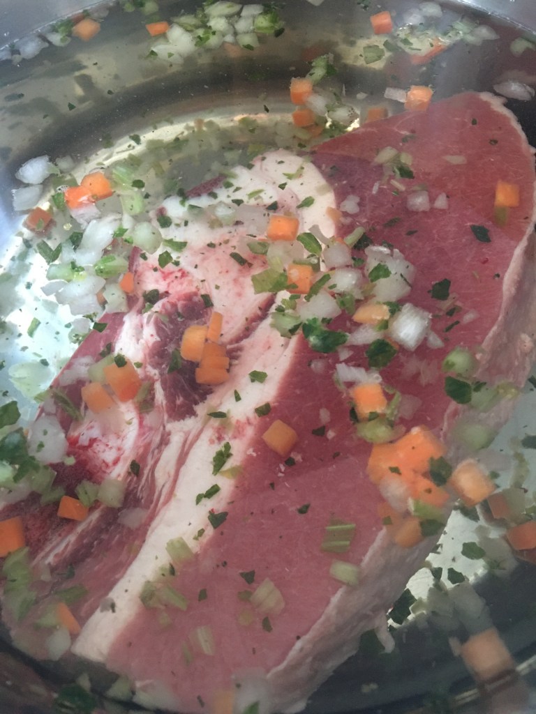 La preparazione del ramen richiede tempo, ma da grandi soddisfazioni. Iniziamo dal brodo. Io uso la pentola a pressione, verso l’acqua, immergo la punta di petto, cipolla, carota e sedano. Faccio cuocere per 25 minuti.