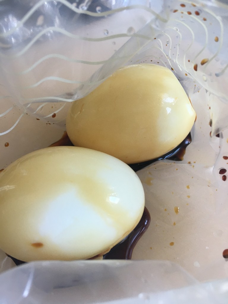 Passiamo ora alle uova, elemento fondamentale del nostro piatto. Le immergiamo in acqua fredda, portiamo a bollore e aspettiamo 5 minuti. Il tuorlo deve rimanere morbido, quindi occhio all’orologio! A cottura ultimata le lasciamo raffreddare, le priviamo del guscio, le mettiamo in un sacchetto pronte per essere marinate nella salsa di soia. Dovranno rimanere immerse per almeno 4 ore.