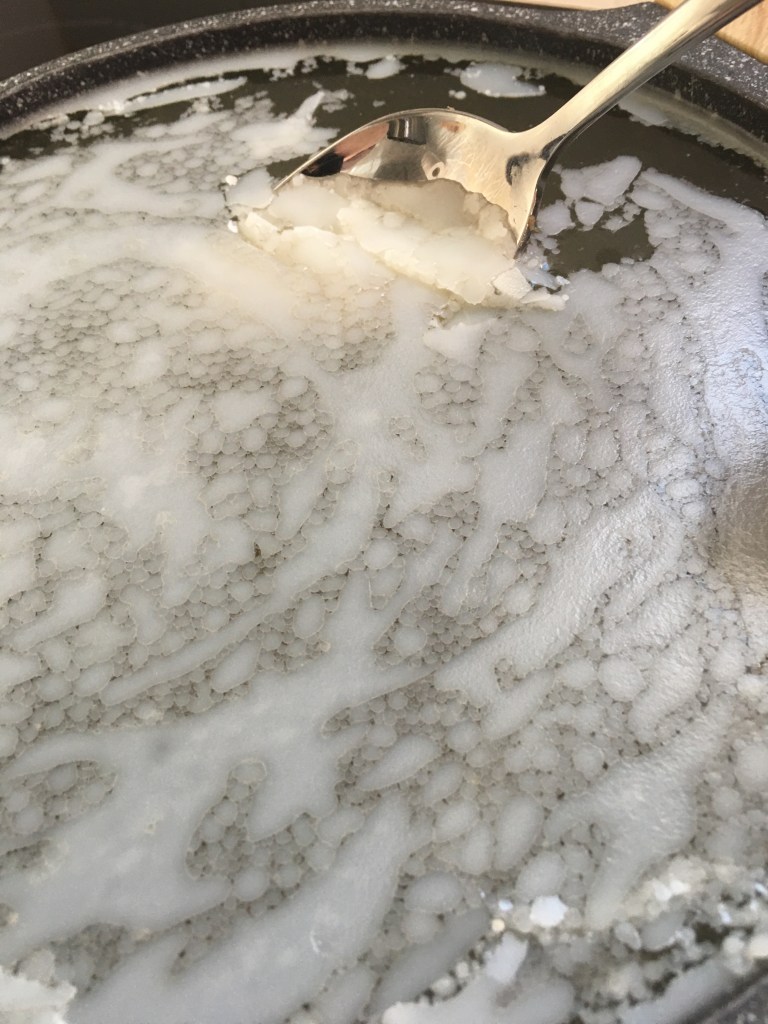 Quando il brodo sarà pronto lasciatelo raffreddare. Vedrete che si formerà una patina bianca, è il grasso che affiora. Con l’aiuto di un cucchiaio lo rimuoviamo.