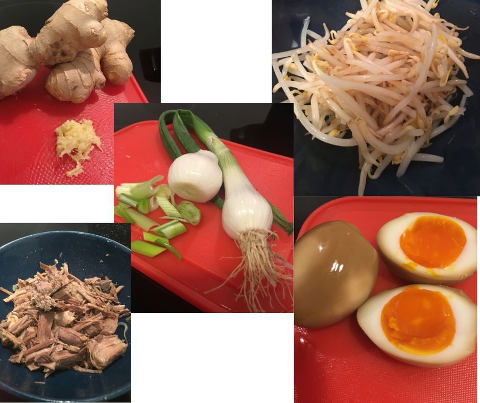 Privato del grasso rimettiamo il brodo sul fuoco a ridurre. Grattugiamo un pezzetto di zenzero fresco e lo mettiamo nel brodo. Prendiamo la punta di petto che si sarà riscaldata nel brodo, la priviamo dell’osso e la sfilacciamo; cospargerla con salsa di soia. Tagliamo il cipollotto e mariniamo leggermente con la salsa di soia anche i germogli. Tagliamo l’uovo a metà.