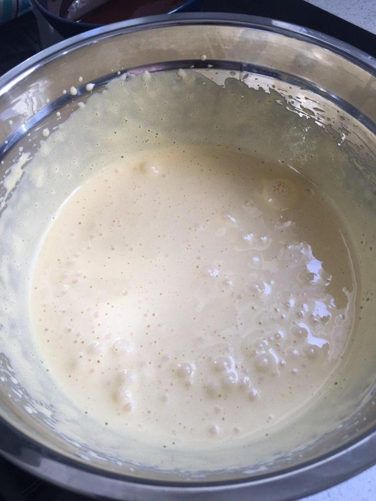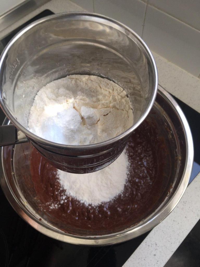 Mescolando aggiungiamo il latte a filo e il composto di burro e cioccolato. Setacciamo poi all’interno farina e lievito.