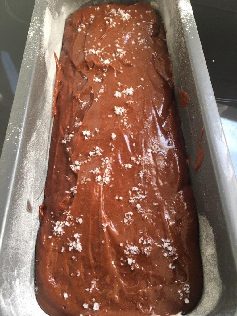 Mescoliamo dal basso verso l’alto per mantenere il composto arioso. Imburriamo ed infariniamo il nostro stampo rettangolare. Versiamo il composto a strati e fra ognuno di essi spargiamo un pizzico di fleur de sel.