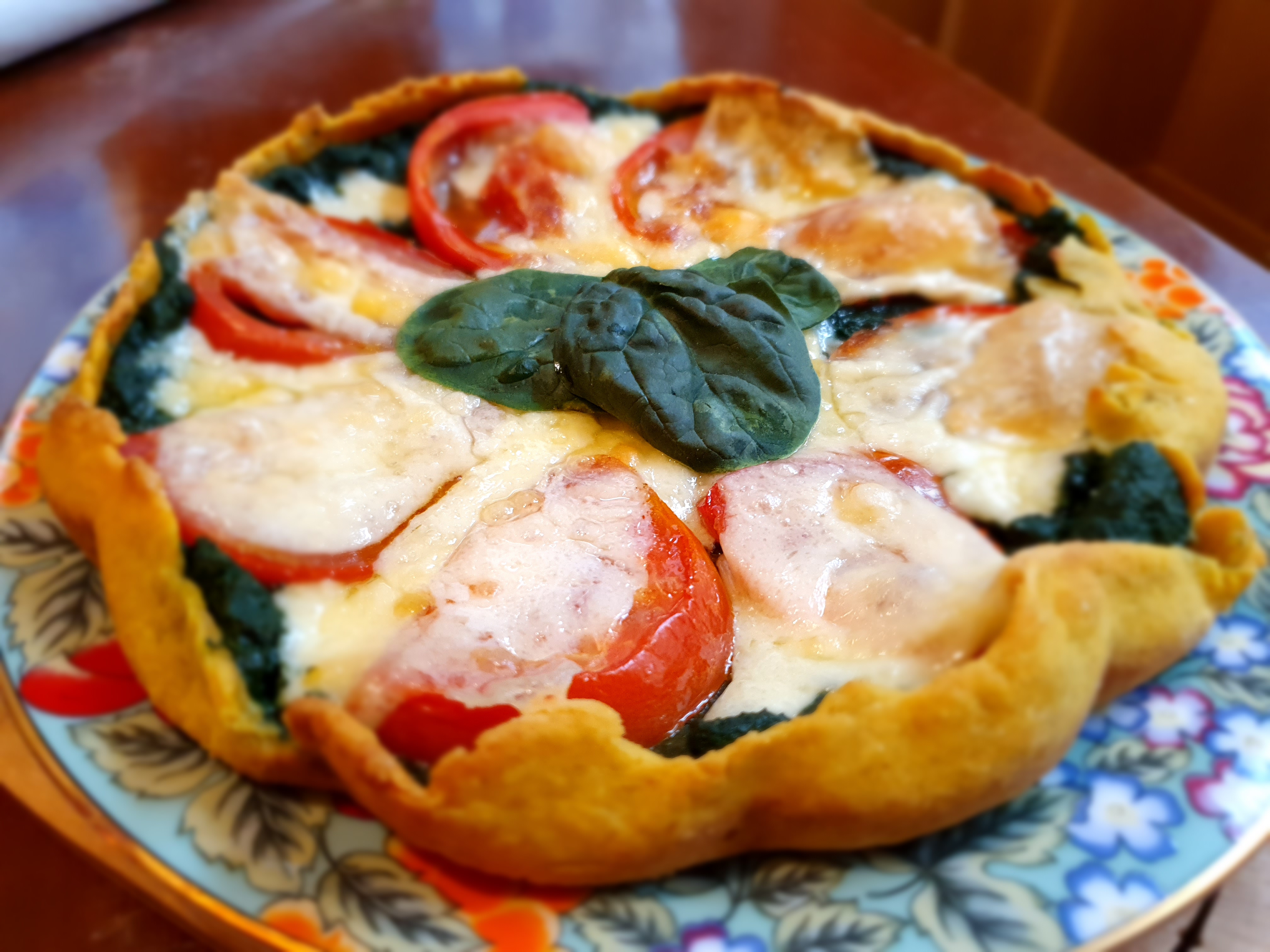 Preparare l’impasto mescolando la farina, l’olio, l’acqua ed un pizzico di sale. Stendere l’impasto su una teglia tonda ed iniziare a farcire la torta con gli spinaci lessati , le fettine di pomodoro e di mozzarella. Condire leggermente con sale e un filo d’olio e cuocere in forno a 180 ° C fino a doratura.