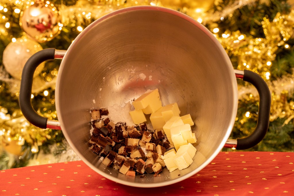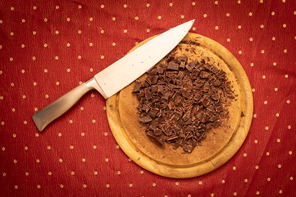 Nel frattempo tagliare grossolanamente il cioccolato e scioglierlo a bagnomaria.