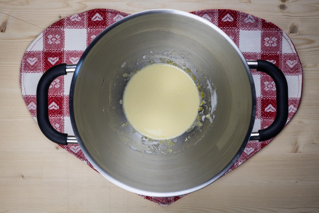 In una ciotola rompere le uova e separare i tuorli dagli albumi. Sbattere i tuorli con lo zucchero per una decina di minuti fino a triplicare il volume.