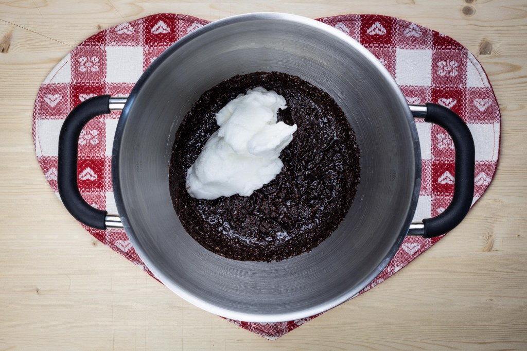 Unire il cioccolato e le mandorle al composto di tuorli e zucchero. Montare a neve gli albumi e incorporarli al composto di mandorle, cioccolato, zucchero e uova con un movimento dal basso verso l’alto.