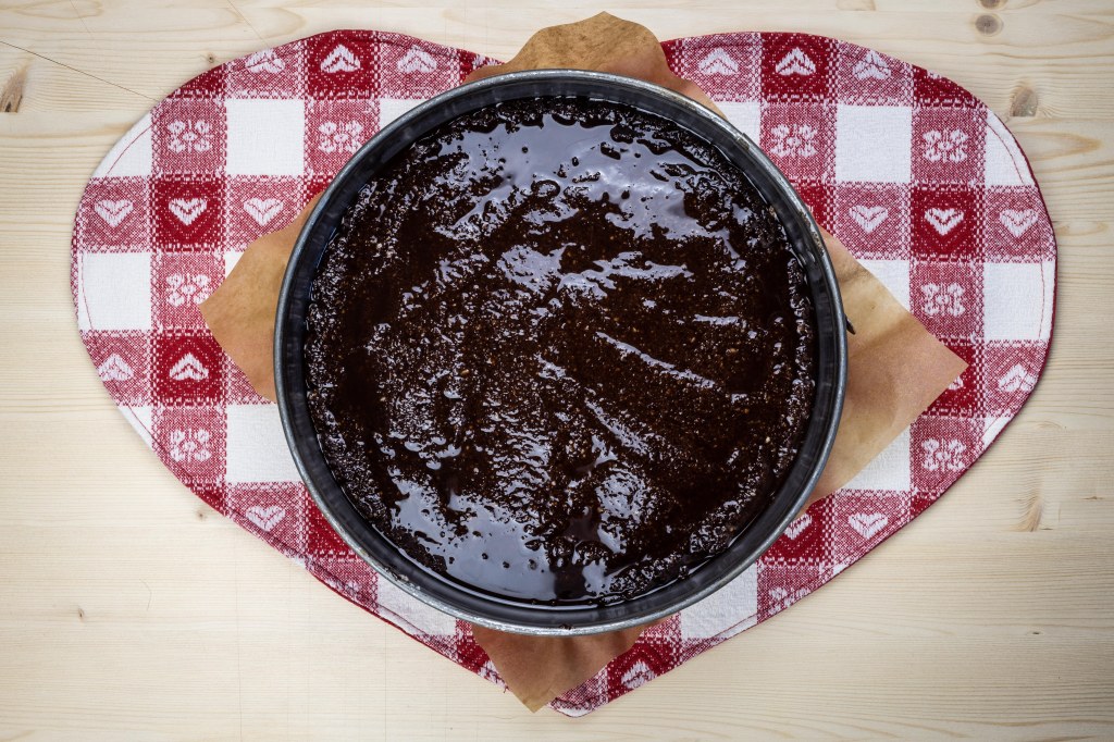 Imburrare e infarinare (o usare una base di carta da forno) una tortiera e versare il composto.