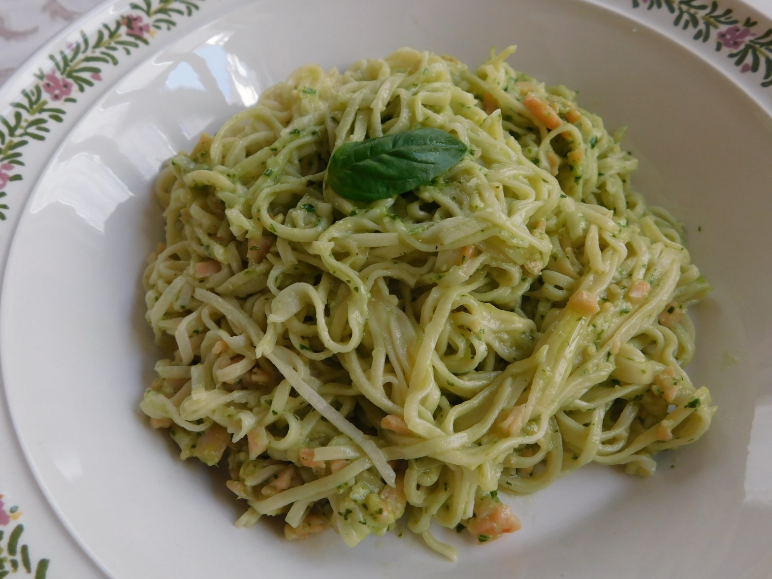 Tagliolini al pesto di anacardi, basilico, e salmone